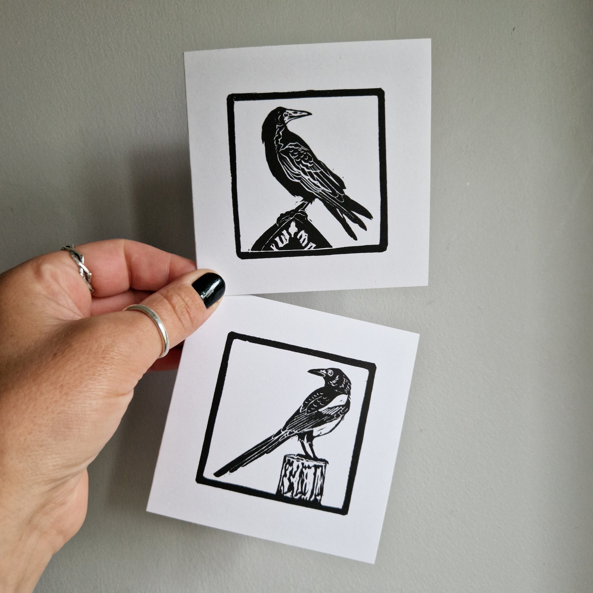 ~Hand carved and printed mini card, choose from the Rook or Magpie